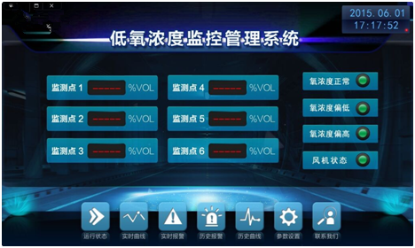 直接点击-低氧浓度监控管路系统-按钮进如;该界面 上可查看到系统运行实际状态并储存、打印报警记录。