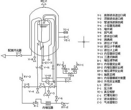 2.1.7在充灌液体期间,应注意贮槽压力表P-1。若贮槽内容器压力上升至超过供液压力或接近贮槽的正常工作压力,应打开内容器放空阀V-13,使贮槽放气泄压。